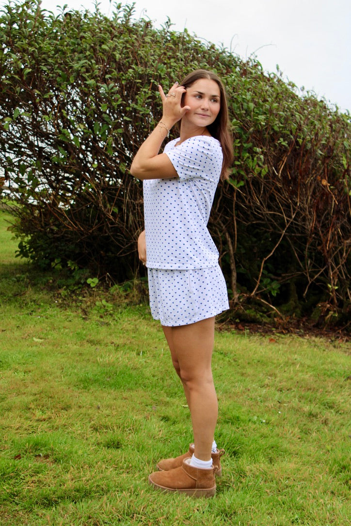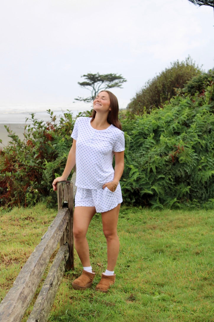 Cozy and polished with a romantic touch, the Soft Slumber Set is made to elevate your nighttime routine. Featuring our signature heart pattern, it's crafted from soft, stretchy modal fabric for breathable, lightweight comfort. The Henley top pairs perfectly with relaxed-fit shorts, complete with a wide, stretchy waistband that hugs gently for a secure yet flexible fit.